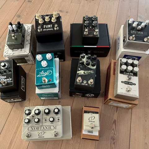 Keeley Dark side og Mad Professor er som nye og kommer i original emballage, T-Rex og Wahcko er brugt i 3-4 år men i rigtig fin stand også