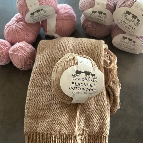 Blackhill Cottonwool Thin garn i brun farve, 50 g pr. nøgle. Materialesammensætning: 50% bomuld og 50% uld. Garnet er økologisk og består af uld fra ikke-klippede får. Løbelængde cirka 350 meter pr. nøgle. I alt 360 gram
