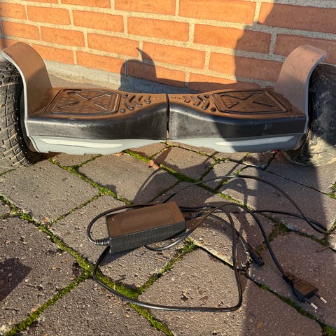 Hoverboard med terrændæk og LED-lys. Hoverboardet har robuste hjul designet til forskellige underlag og LED-lys for synlighed. Det er egnet til personlig transport og fritidsbrug. Baterriet skal skiftes