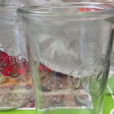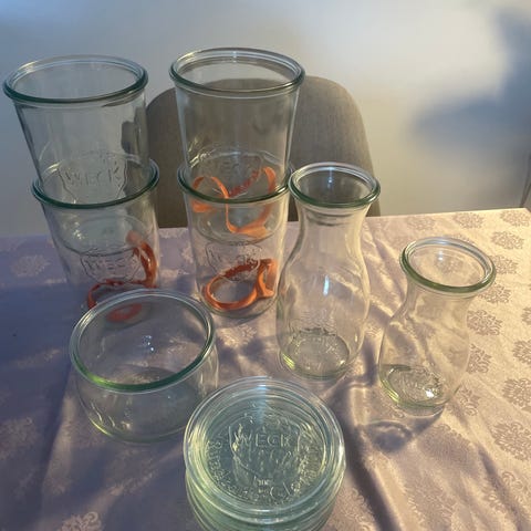 Patentglas. Gummiringe til WECK-glas, metalclips til WECK-glas. 5 træskeer. 3 små sirupsflasker. 1 snapseflaske. Metalringe til henkogningsglas. To glaslås til henkogningsglas.