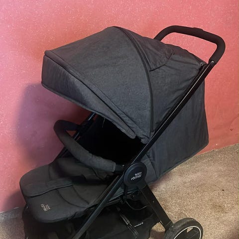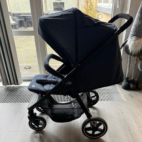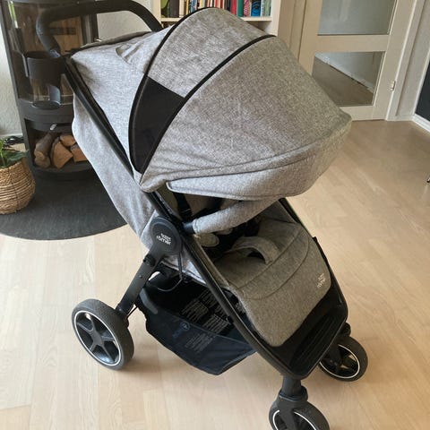 Britax Römer klapvogn i grå farve. Klapvognen har sikkerhedssele og polstret sæde. Designet til børn med fokus på komfort og sikkerhed.