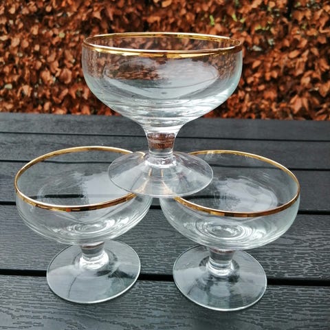 Det er lavet af klart glas med en karakteristisk guldstribe langs kanten.