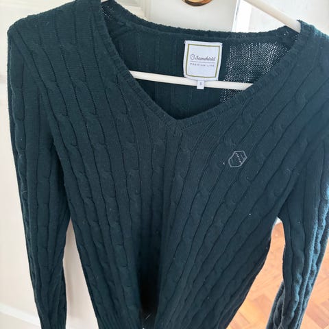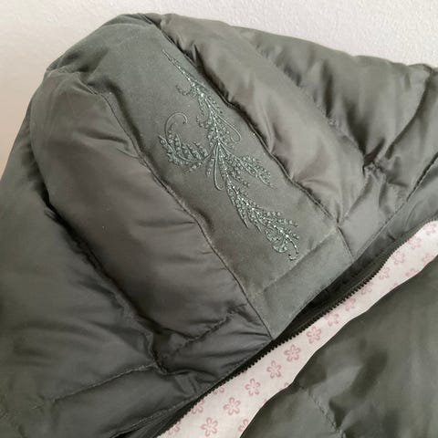 Jakken har en lang model med hætte og pelskant/aftagelig. Jakken har lynlås bagpå og sidelommer/ den ene lynlås lomme virker ikke. Størrelse S