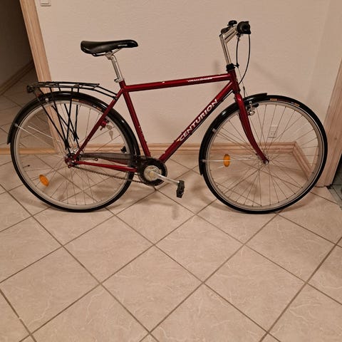 Sælger denne Centurion herrecykel med 28” hjul og i størrelse M. Det er en ældre cykel men den er 100% i orden og kører super godt. Den er gennemgået fra A-Z og spiller bare med gode dæk og massere af kilometer tilbage i kæde og tandhjulene. Den har fået nye håndtag og bremseklodser foran. Den er udstyret med skærme, støtteben, bagagebærer og lås.