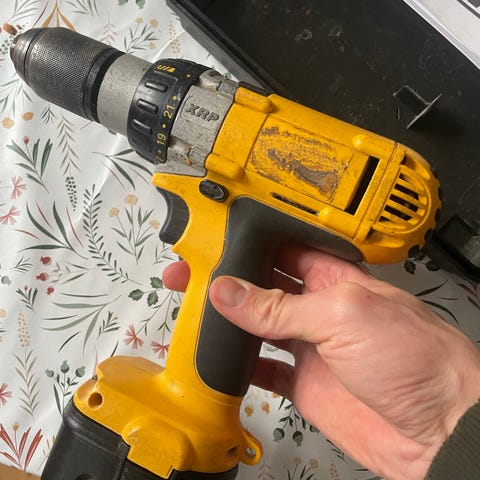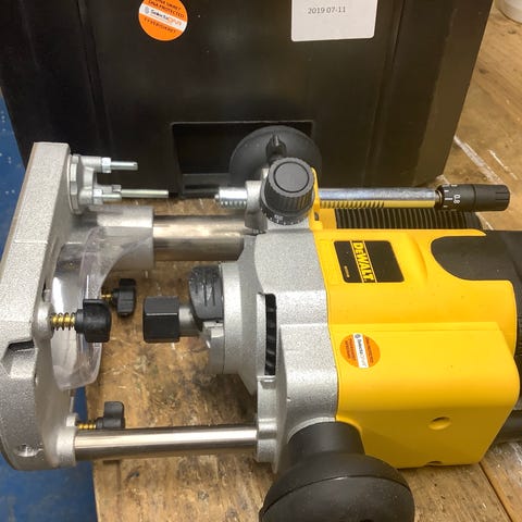 DeWalt elektrisk fræser med gul og sort design. Udstyret med ledning og håndtag for bedre kontrol under brug.