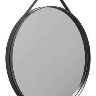 Hay rundt spejl med en enkel ophængningsrem. Spejlet har en neutral farve og en slank ramme, der gør det velegnet til forskellige rum og indretninger.