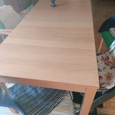 Spisebord med 2 tillægplader a 40cm som ligger under borde. L 140. B84. H74 . så borde kan blive 220 cm