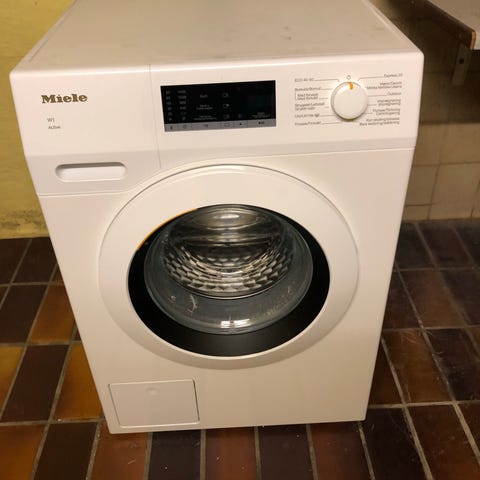 Miele vaskemaskine med frontbetjening. Maskinen er designet til effektiv vask og har en rummelig tromle til daglig brug.