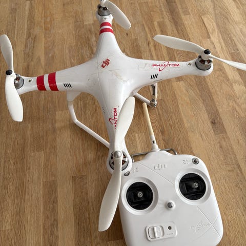 DJI Phantom drone med fjernbetjening, leveres i en robust opbevaringskasse. Dronen er hvid og har fire propeller. Egnet til luftfotografering og rekreativ brug. Stand ukendt