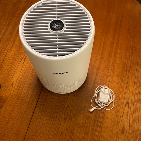 Xiaomi Smart Air Purifier 4 Compact luftfilter i hvid farve. Enhed designet til effektiv luftrensning med kompakt størrelse. Leveres med strømadapter og kabler. Velegnet til brug i hjemmet for forbedret luftkvalitet.