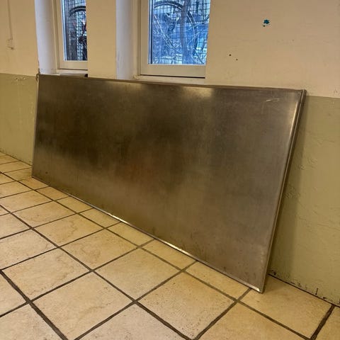 Rustfrit stål bord med hvid bordplade. Bordets mål i længden og