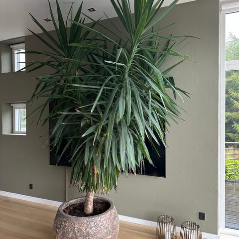 Indendørs grøn plante placeret ved vindue med lange smalle blade. Anvendelig som dekoration i hjem eller kontormiljø.