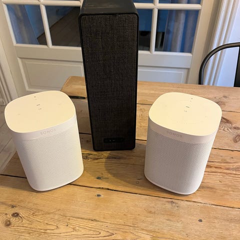 Sonos højttalere i sort farve. Kommer med tilhørende kabler og beslag til vægophæng. De har været brugt som baghøjttalere i surround.