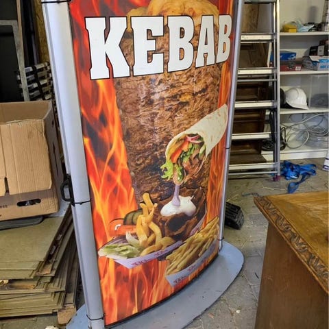 Reklameskilt med motiv af en kok, udført i metal og plastik. Skiltet har en plads til udskiftelig plakat eller skilt, der kan anvendes til butiks- eller restaurantreklame. Designet er fritstående og velegnet til udendørs brug.