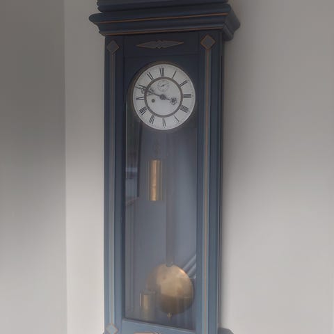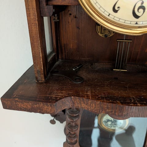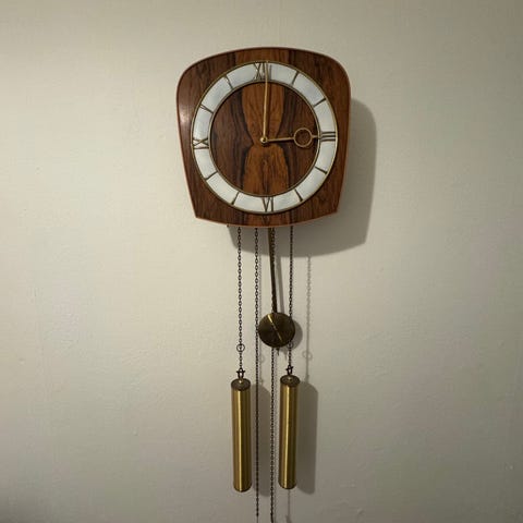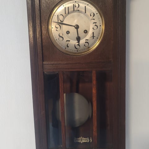 Kieninger vægur med pendul og to vægte i messing samt urskive med træramme. Uret er fra midten af århundredet, har et klassisk design med tydelige time- og minutmarkeringer. Velegnet til ophængning på væg og fungerer som både tidtager og dekorativt element.