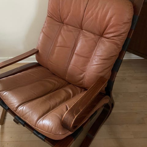 Er usikker på om det er ægte læder, men den ligner selvfølgelig læder. Behagelig at sidde i og har bare stået på loftet det sidste års tid. Er lige blevet tørret af med en klud, derfor den skinner.