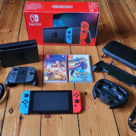 Kommer ikke med joycons, men der medfølger en original Pro controller (næsten som ny), samt en lækker grip controller til når man skal spille håndholdt (medfølger forskellige joystick der kan udskiftes)
