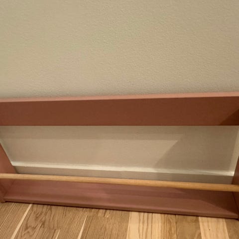 Der er tremmer til begge sider, den kan også bruges som sofa. Kant pladen til bunden er knækket men repareret med ekstra pind. Der er til at alle dele kan være enten lyserød eller lyseblå. Så man skifter bare imellem den ønskede farve.