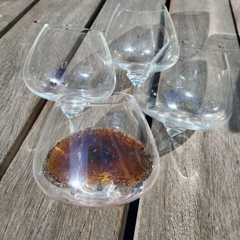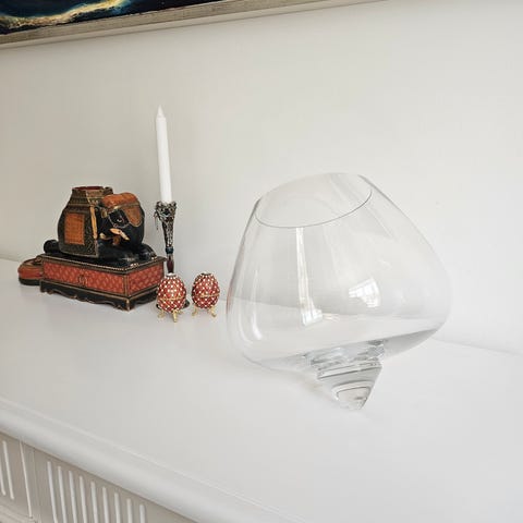 Normann Copenhagen Giant Cognacglas i klart glas. Et stort cognacglas med en unik form og en bred åbning, designet til at fremhæve aromaen af cognac. Glasets dimensioner ses på billederne for præcis størrelse.