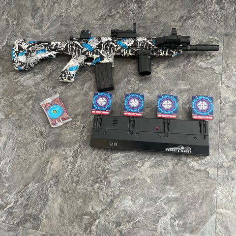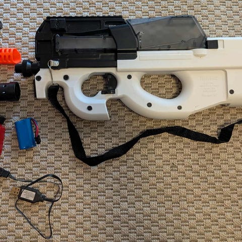 Gelblaster M416 fuldautomatisk gelblaster på opladeligt batteri, brugt ganske lidt, ser ud som og fungerer som ny og har ingen skrammer. Kan skyde ca 20 meter med op til ca 100 skud pr refill. Batteriet rækker til brug i en til halvanden time. 250 kr