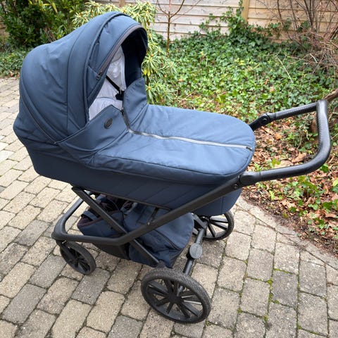 Odder Vida fra 2021 med lift, madrasser, regnslag, myggenet og sele. Velholdt. Brugt til 1 barn