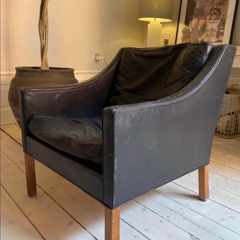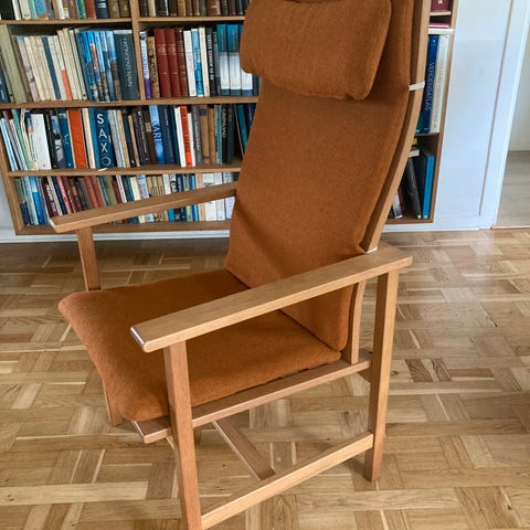 Klassisk designikon fra Fredericia Furniture, designet af Børge Mogensen omkring 1956. Solid egetræsstel ombetrukket i lilla uldstof. (Man sidder virkelig godt!)