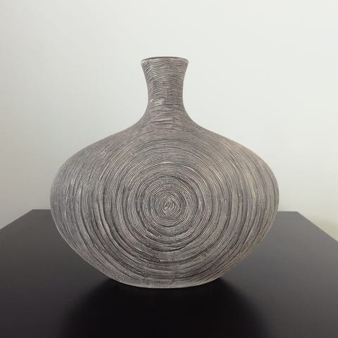 Ilva dekorationsvase med en rund form og en smal åbning. Vasen har en mat, grønlig overflade med horisontale linjer som dekorative detaljer. Velegnet til indendørs brug som dekoration.
