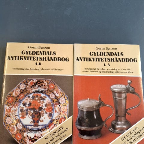 Gyldendals Antikvitets Håndbog bog sæt bestående af to bind. Anden udgave med tegninger af Gorm Benzon og fotografier af Arne Bruun Rasmussen. Indeholder omfattende information om antikviteter, opdelt i to bind med bogstaverne A-K og L-Å. Udgivet af Nordisk Bogproduktion AS, Danmark, 1986.