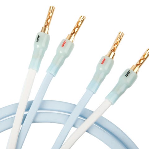 Omni Speaker - højtalerekabler -Cable. To kabler i hvid og en i sort. Kablerne er beregnet til tilslutning af højttalere og har uisolerede ender til direkte tilslutning. Kabeltypen er specificeret som Prism Omni, hvilket indikerer en særlig designet højttalerkabeltype af høj kvalitet fra HI-FI KLUBBEN