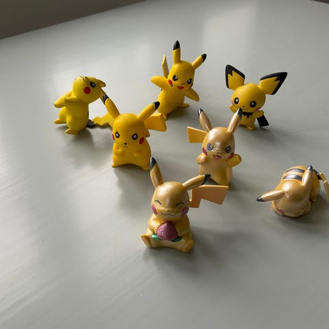 Pokémon legetøjssæt indeholdende flere forskellige figurer af Pokémon-karakterer samt en grøn taske/trænersæt og en fjernbetjening med knapper. Figurenes størrelse og farver varierer, og sættet er velegnet til børn og samlere.
