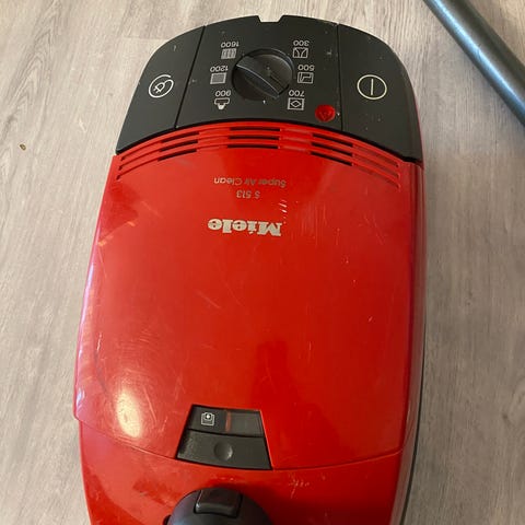 Miele Blizzard CX1 støvsuger med posefri teknologi. Enheden har en gennemsigtig beholder til opsamling af støv, som nemt kan tømmes. Støvsugeren er udstyret med et fleksibelt rør og en børste til forskellige gulvtyper. Designet med hvid og rød farve.