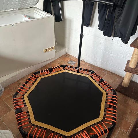 Neo Sport trampolin med sort hoppeflade og grøn kant. Designet til indendørs brug og egnet til børn og voksne. Robust ramme med elastiske snore til fastgørelse af hoppefladen.