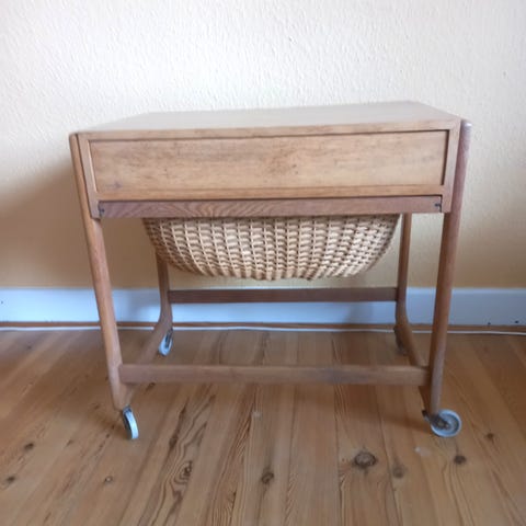Lille praktisk bord med skuffe og kurv til sytøj eller strikketøj.