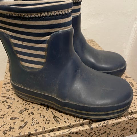 Birkenstock gummistøvler til børn, unisex, størrelse 33, i blå farve. Fremstillet i let materiale, egnet til vådt vejr og udendørsbrug. Gives væk. Kan hentes eller sendes med instabox for 40kr.