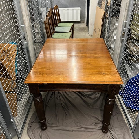 Længde: 140/240cm bredde:90cm højde:76cm med 4 spisestole i genbrugslæder...mulighed for 6 stole