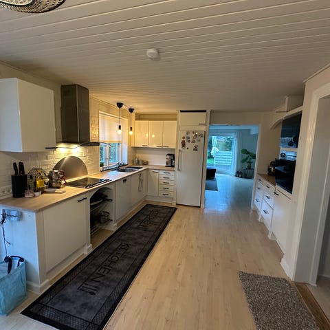 Køkken med hvide skabe, træbordplader og integrerede hvidevarer. Indeholder vask, opvaskemaskine, mikrobølgeovn og ovn. Skal selv afmonteres og tages ned.