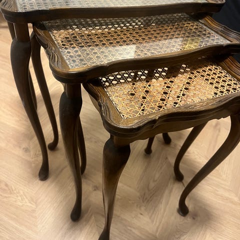 Elegant sæt med tre indskudsborde i bambus-inspireret metalramme med gylden stel og tonede glasplader. Bordene kan nemt skubbes ind under hinanden og er både dekorative og praktiske.