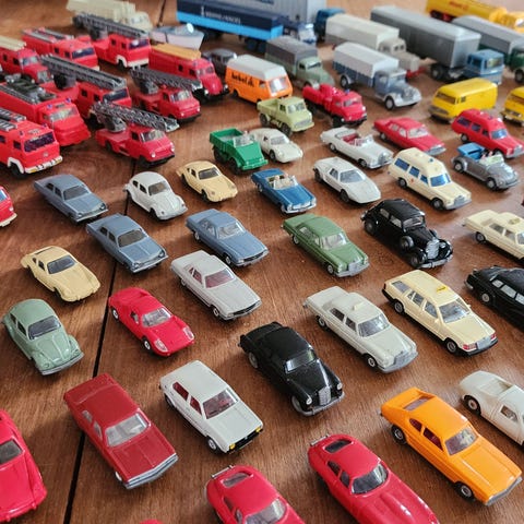 10 Safir legetøjsbiler, franske, fremstillet af Safir i 1960’erne og 70’erne. 10 biler i fin stand, der er bl.a. Renault, Citroën og Ford.