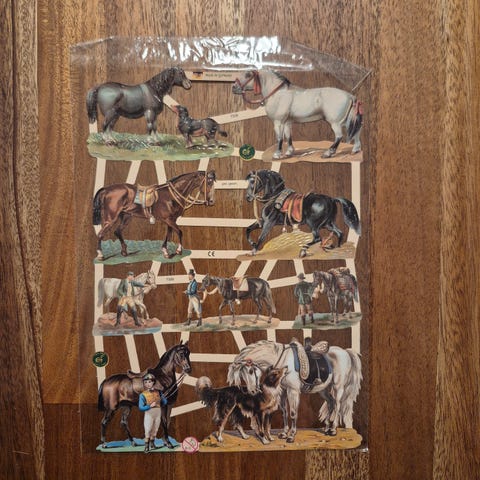 Glansbilleder - pakke med et ark. Forestiller heste uden glimmer. I original emballage. Fra ikkeryger hjem.