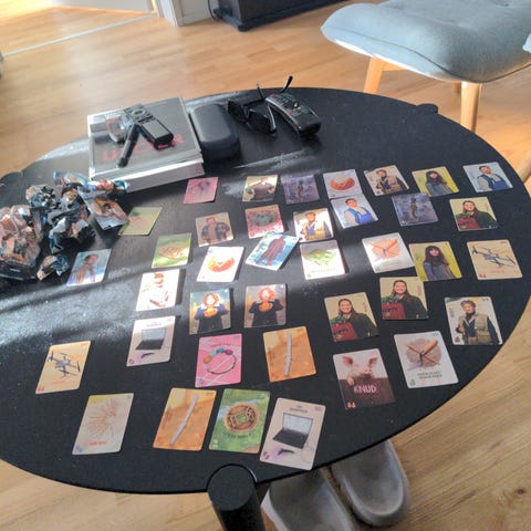 Kortspil bestående af kort med forskellige motiver og billeder. Kortene viser forskellige personer, objekter og symboler i farverige illustrationer. Velegnet til spil og samling.