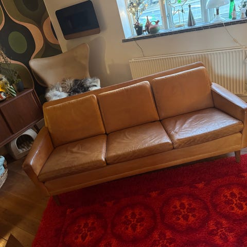Antikke sofaer af massivt fyrretræ med originale hynder betrukket med lys alcantara som kan aftages og vaskes, sider med fransk flet uden brud. Udført hos Georg Petersens, årgang 1975, Danmark.