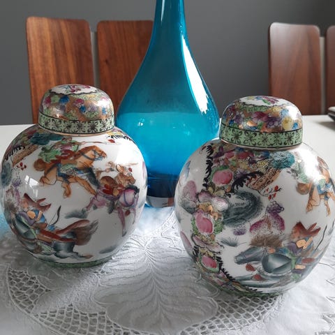 FIN KINESISK KRUKKE MED LÅG,FLOT DEKORET MED BLOMSTER , FUGLE,OG TRÆ!!