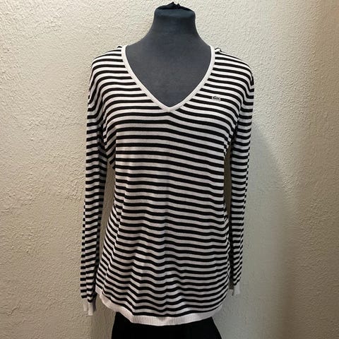 Lacoste Andet sweater til kvinder lavet af bomuld. Sweateren har en stribet blå og hvid farve og en V-hals. Den er i størrelse 46 og egnet til kvindeligt brug.