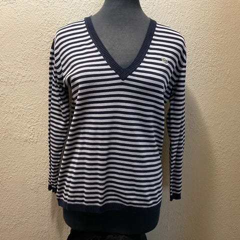 Lacoste Andet sweater til kvinder i størrelse 44. Sweateren er lavet af bomuld og har et sort-hvidt stribet mønster. Den har V-hals og lange ærmer.