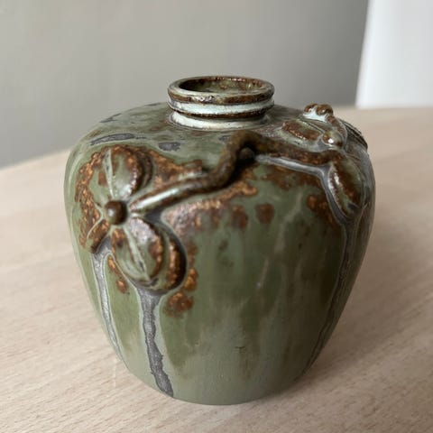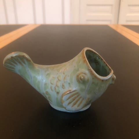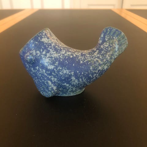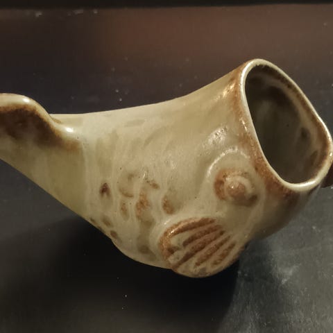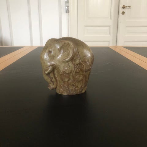 Arne Bang figur af bjørneunge, må have siddet fast i ovnen, da mærket i bundet er delvist slebet væk.