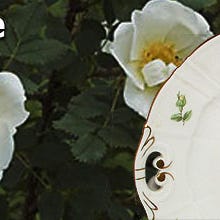 Del af elegant klassisk håndmalet vintage Klitrose stel i hvidt porcelæn med guldkant. Oldemorstel.