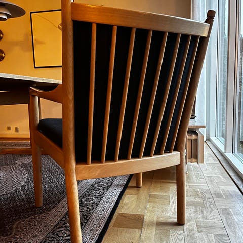 Den brugte Hans Wegner lænestol er med Original ternet hestedækken betræk på sæde og ryglæn, mens stellet er af eg. Stolen hører til blandt klassikerne, og du får her en elegant og komfortabel lænestol, der kan bruges mange steder. Brugs den for eksempel i stuen derhjemme eller i sommerhuset sammen med et sidebord.