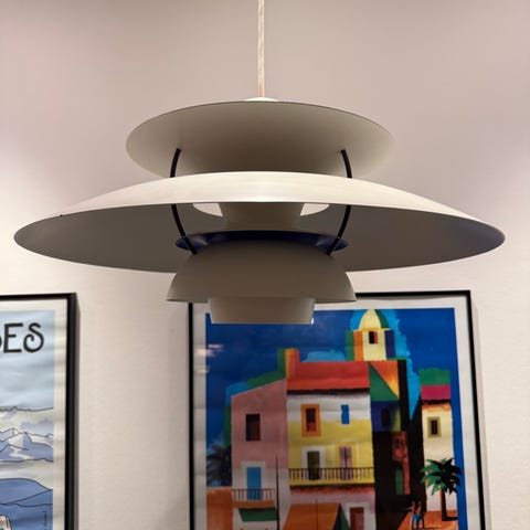 Louis Poulsen PH lampe pendel 5 designet af Poul Henningsen. Lampen har en flerlags skærmstruktur med en hvid overflade og blå indvendige detaljer. Den er fremstillet i metal og er beregnet til ophængning i loftet. Den er 50 cm i diameter.