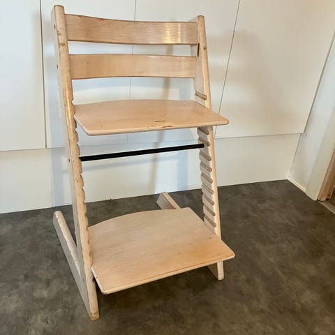 Stokke højstol i træ. Designet til børn med justerbare trin og fodstøtte for komfort og støtte.