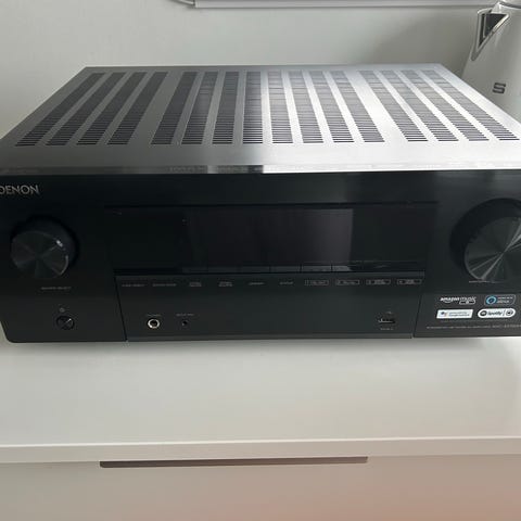 Denon AV Receiver med fjernbetjening. Enhed til brug i hjemmebiograf og lydsystemer med flere tilslutningsmuligheder. Sort farve 7.2